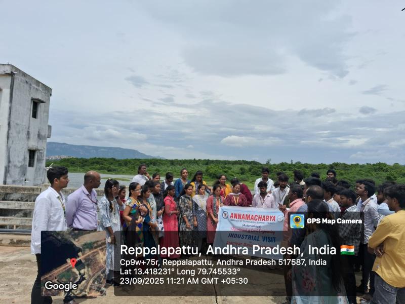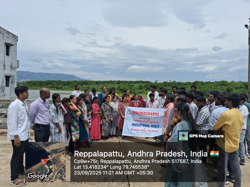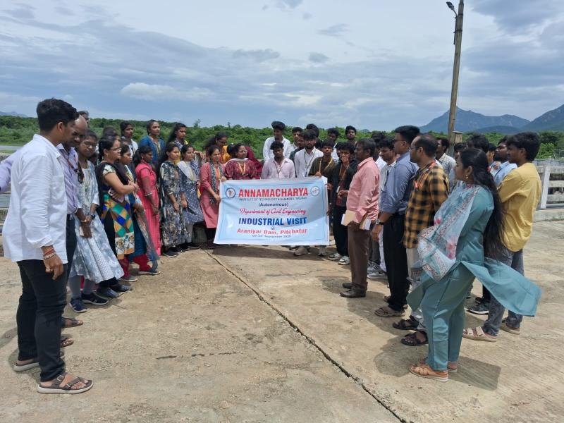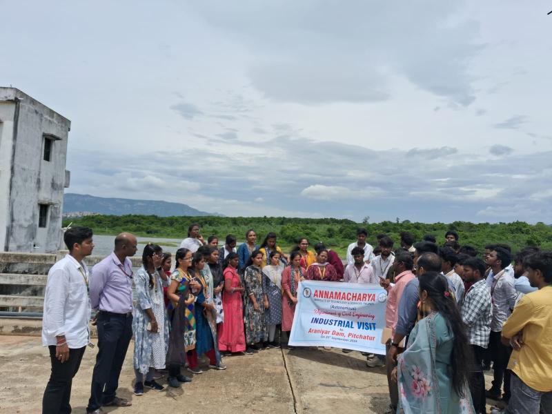 The Department of Civil Engineering, AITS Tirupati, organized an industrial visit to the Araniyar Dam on 23rd September 2025 for 54 final-year students and faculty. The visit provided insights into dam engineering, water resource management, and structural components like spillways and sluice gates. Site engineers explained design, construction, and maintenance aspects, helping students connect theoretical knowledge with real-world engineering practices.