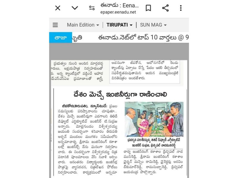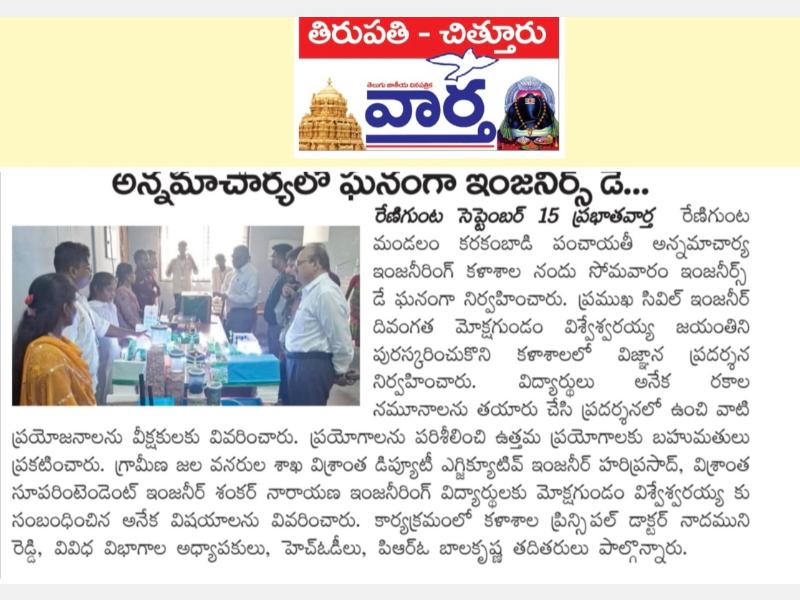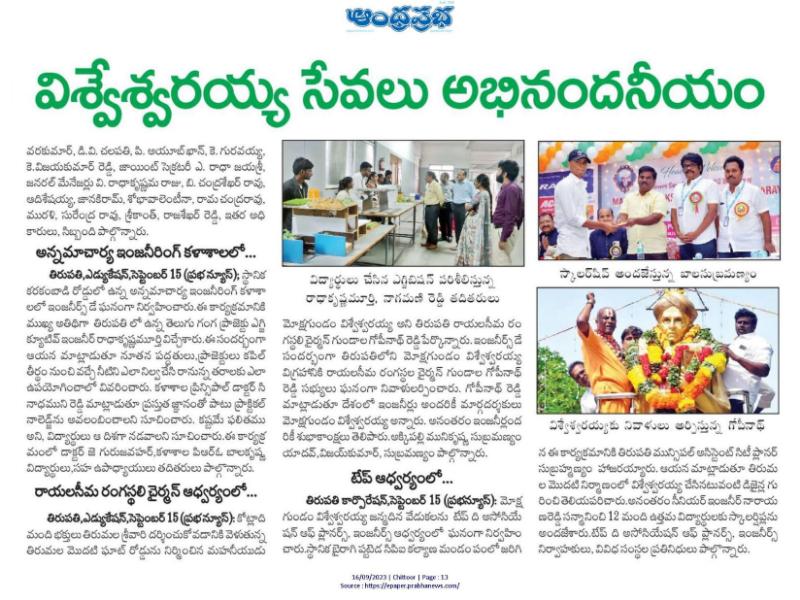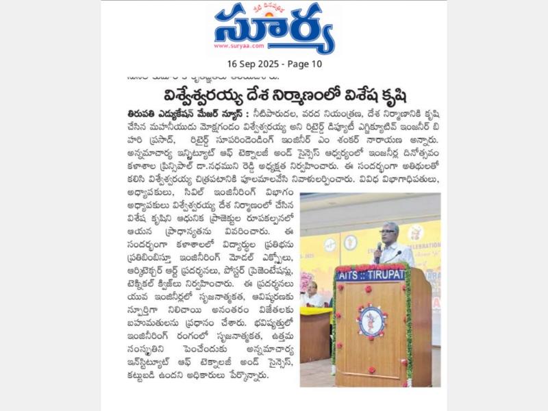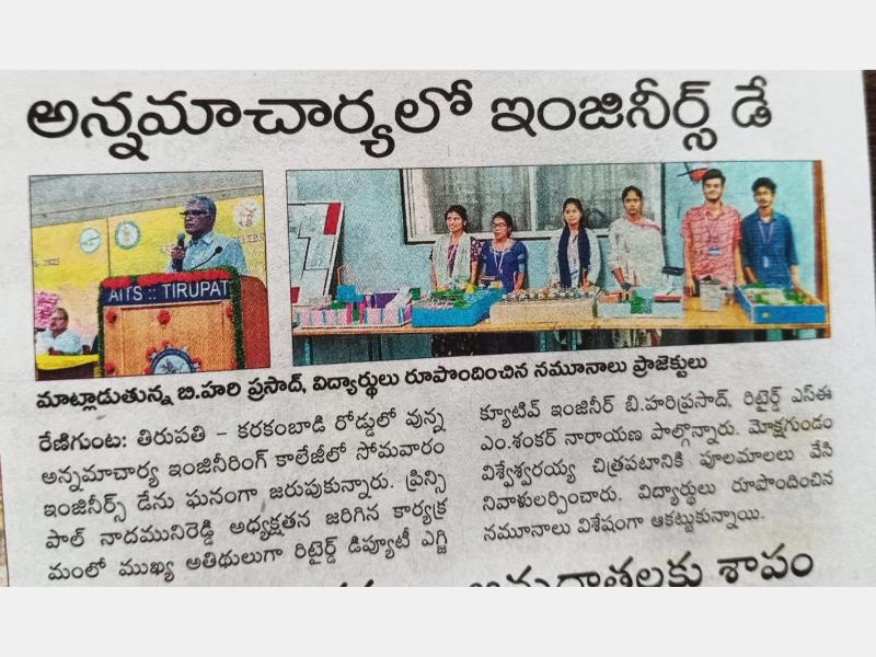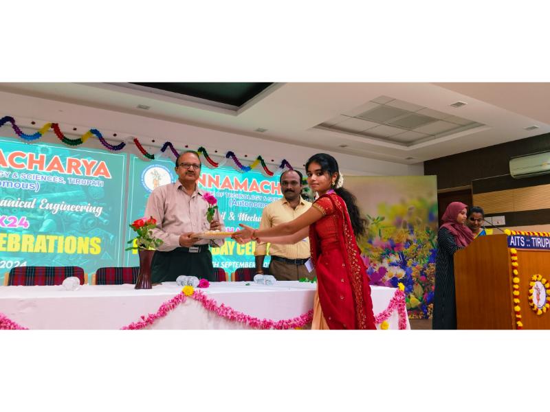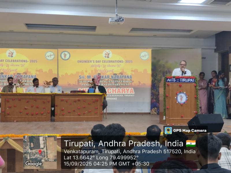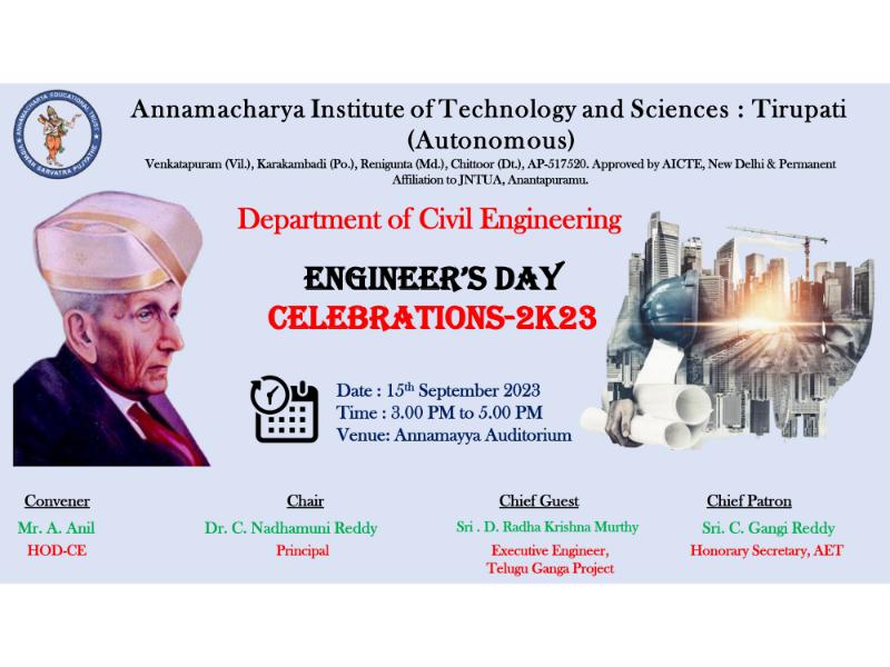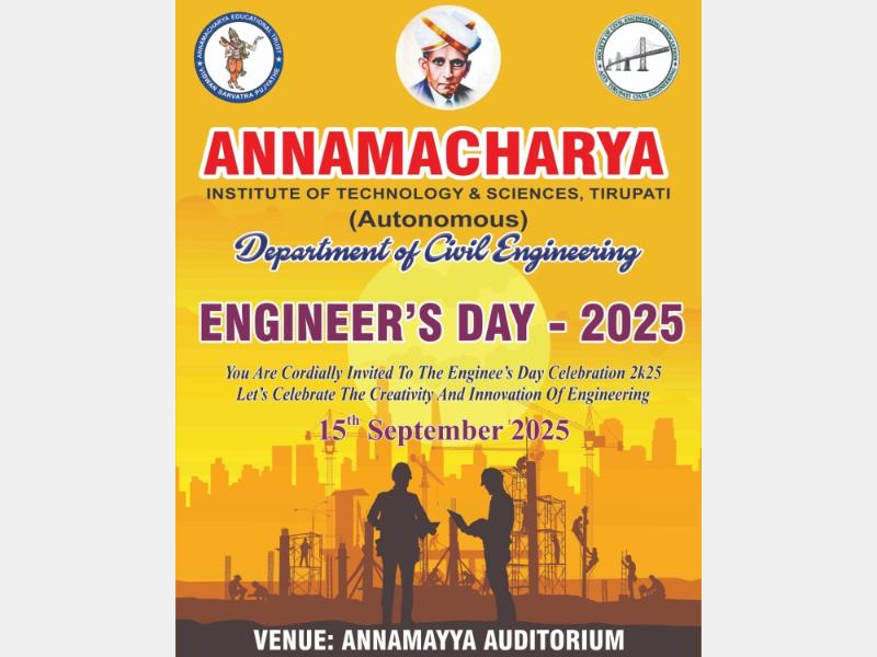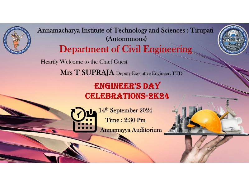 The Department of Civil Engineering, Annamacharya Institute of Technology & Sciences, Tirupati, celebrated Engineer’s Day on 14th September 2024 at the college auditorium. Dr. C. Nadhamuni Reddy, Principal of AITS, highlighted the importance of sustaining college life with moral values. The chief guest, Deputy Executive Engineer of TTD, Smt. T. Supraja, emphasized the success of a civil engineering career. The Head of the Department praised engineers as problem solvers, acknowledging their crucial role in society’s development. The event was well-received by both faculty and students.
