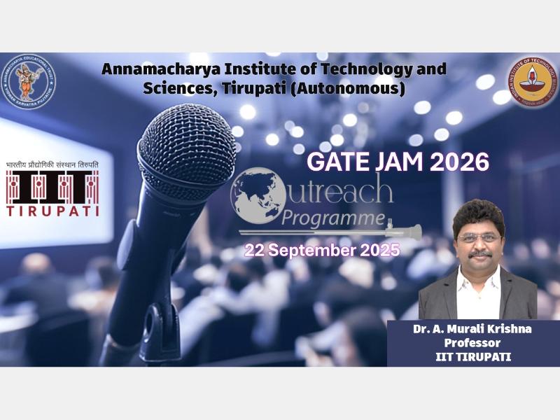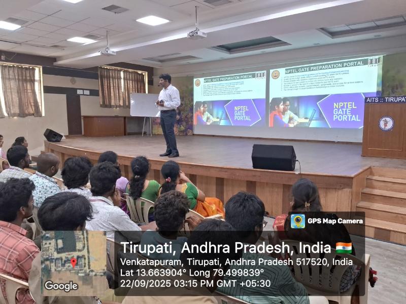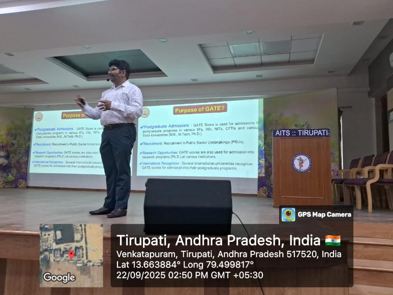 The Department of Civil Engineering, AITS Tirupati, organized an outreach programme on “The Importance of GATE 2026” on 22nd September 2025. Dr. A. Murali Krishna, Professor of Geotechnical Engineering at IIT Tirupati, highlighted GATE’s role as a pathway to higher education, PSU careers, and research opportunities. Sponsored by IIT Madras, the session aimed to motivate and guide students in their GATE preparation