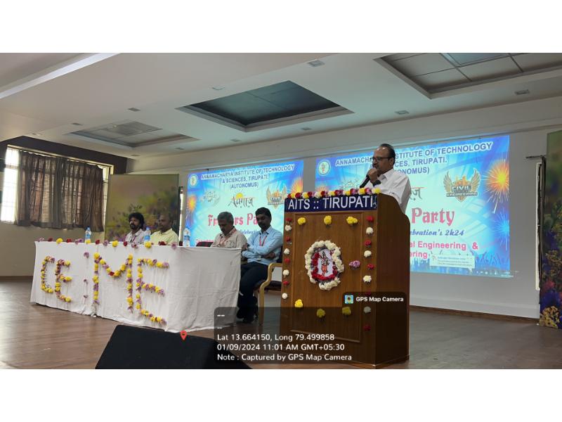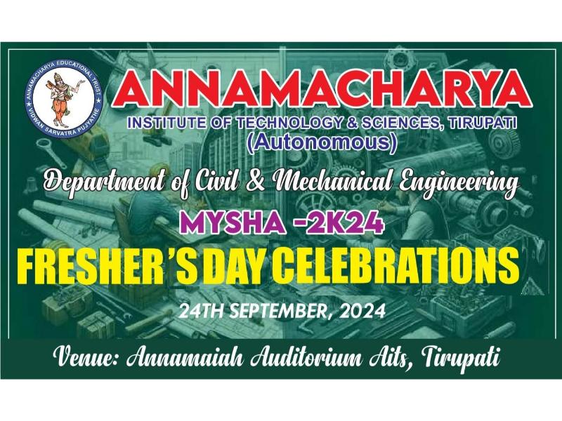 The Departments of Civil and Mechanical Engineering, AITS Tirupati, celebrated Fresher’s Day on 24th September 2024 in the college auditorium. The principal and heads of departments emphasized discipline, career planning, and the importance of core engineering branches. Professors Kumar and Guru Jawahar shared valuable insights, while coordinator Mrs. Meenu Priya organized engaging cultural activities. The event created enthusiasm and motivation among new students for their academic journey.