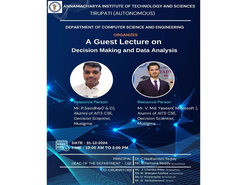 The Department of CSE, in collaboration with the Alumni Association Cell, organized a guest lecture on 31st December 2024 on “Decision Making and Data Analysis.” The session enhanced students’ understanding of data-driven decision-making, with active participation from 408 students.