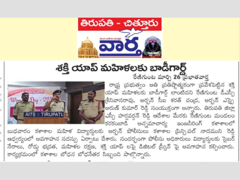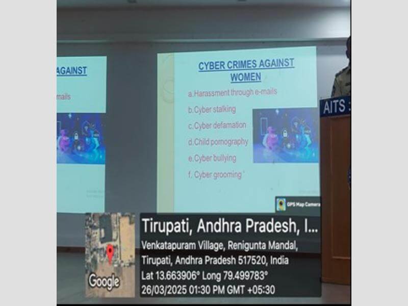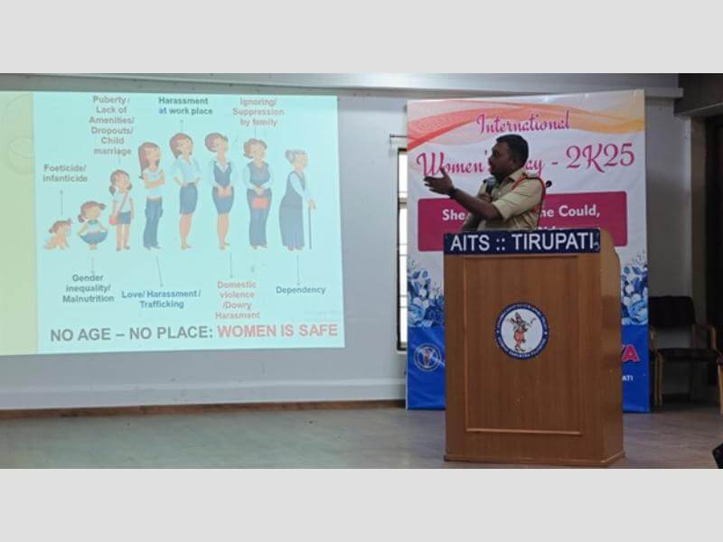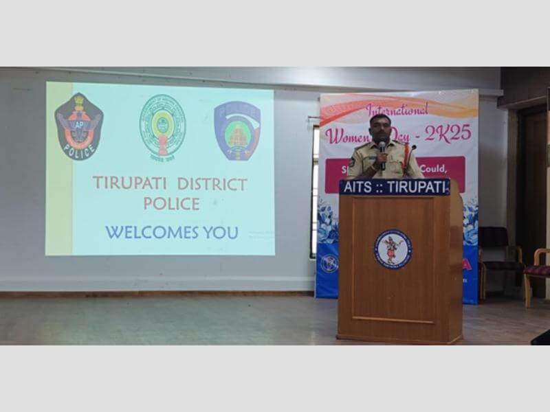 In association with the Women Empowerment Cell (WEC), Women Protection Cell (WPC), Internal Complaint Committee (ICC), and IQAC, AITS Tirupati organized an awareness program on Road Safety, Women Security, and the Shakti App on 26th March 2025 at Annamayya Auditorium, under the guidance of Tirupati District SP Shri Harshavardhan Reddy.