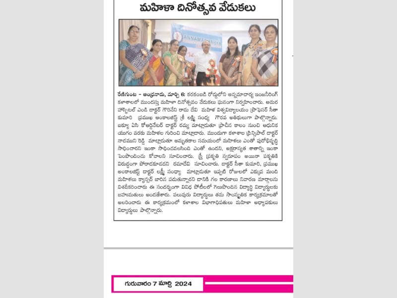 The Women Empowerment Cell (WEC), in association with the Women Protection Cell (WPC), Internal Complaint Committee (ICC), and Internal Quality and Assurance Cell (IQAC) of AITS, Tirupati, organized International Women’s Day Celebrations on 6th March 2024 at Anamaya Auditorium.